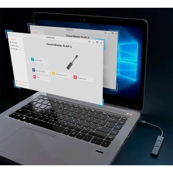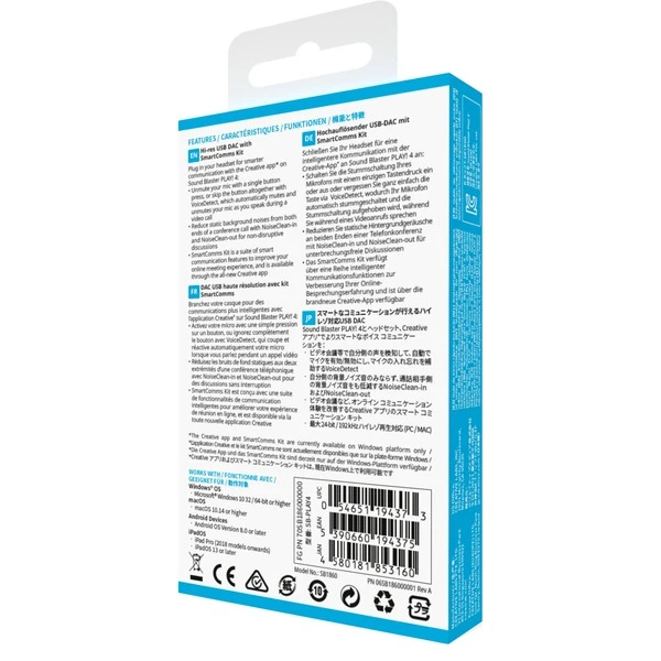 Mit dem Creative Sound Blaster PLAY! 4 vereinfacht man die Art und Weise, mit welcher man online miteinander kommuniziert. Dieser tragbare Plug-and-Play-Hi-Res-USB-DAC wird mit SmartComms Kit geliefert, einer Suite intelligenter Kommunikationsfunktionen, darunter VoiceDetect, welches das Mikrofon automatisch stummschaltet und dies auch wieder aufhebt, und die Zwei-Wege-Geräuschunterdrückung mit NoiseClean-Funktionen, die dafür sorgen, dass man bei Online-Anrufen deutlich hören und auch selbst gehört wird – ein Muss für jeden Arbeitsanruf! Zusätzlich zu all den Software-Funktionen verfügt der Sound Blaster PLAY! 4 auch über eine EQ-Taste mit 2 Sound-Modi: Dynamic und Bass Boost, die mit jeder Art von Inhalt, wie Musik, Filme und sogar Spiele, hervorragend funktioniert! Hinter allem steht das, was Creative am besten kann: Audioqualität. Durch hochauflösendes Audio mit einem 192 kHz/24-Bit-DAC und einer klaren Audioqualität von 110 dB, wird man nie wieder zum Standard-Audio des PCs zurückkehren wollen. Dieses sofortige Audio-Upgrade ist außerdem extrem leicht (8,3 g) und super portabel, so dass man es überallhin mitnehmen kann. Der Creative Sound Blaster PLAY! 4 unterstützt zudem die Kompatibilität über mehrere Plattformen hinweg – von PC, Mac bis PS5, PS4, Nintendo Switch und mehr.Art.-Nr.: 1718537