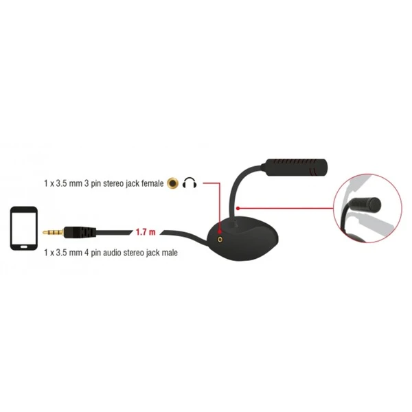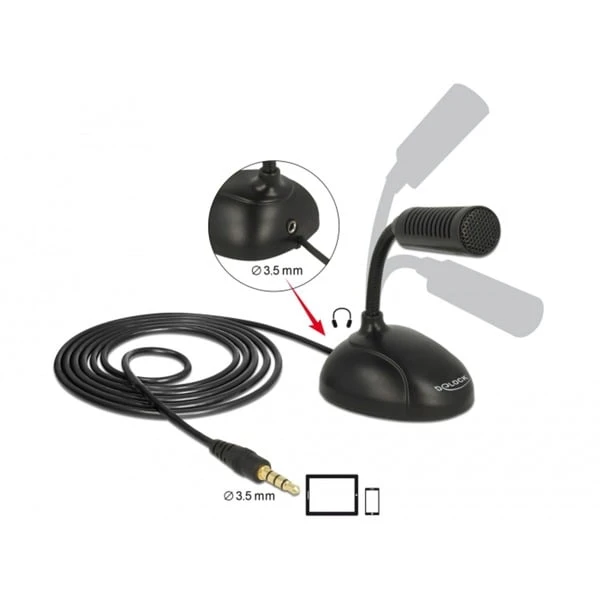Das DeLOCK Kondensator Mikrofon eignet sich für den mobilen Einsatz an Smartphones, Tablets oder anderen Geräten mit 3,5 mm Klinkeneingang. Es kann für Sprach- oder Gesangsübertragungen verwendet werden und bleibt dank des gummierten Standfußes immer an Ort und Stelle. Der Hals des Mikrofons ist schwenkbar, so dass man ihn stets in die optimale Position bringen kann. Da das Mikrofon selbst über einen 3,5 mm Klinkeneingang verfügt, kann man gleichzeitig einen Kopfhörer verbinden.Art.-Nr.: 1483345