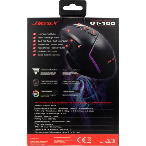 Die ergonomische Nitrox GT-100 RGB Gaming-Maus von Inter-Tech bietet eine Vielzahl individueller Einstellmöglichkeiten. Auf sieben frei belegbaren Makro-Tasten lassen sich mittels Software bevorzugte Befehle und Aktionen für verschiedene Spiele festlegen. Auch die Auflösung des SUNPLUS 6651 Sensors kann in sechs Stufen zwischen 200 und 6.400 dpi wahlweise mittels Umschalter oder Software angepasst werden. Die RGB-Beleuchtung mit sechs wählbaren Effekten sorgt für den individuellen Look der Nitrox GT-100 RGB und das 1,5 m lange, gesleevte USB-Kabel mit integriertem Ferritkern macht unabhängig von Batterien und sorgt für einen störungsfreien Spielbetrieb. Hochwertige Klickschalter bieten zudem eine hohe Lebensdauer von weit über 10 Millionen Klicks.Art.-Nr.: 1703761