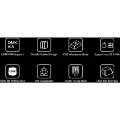 | Besonderheiten | Aluminiumrahmen (6063 Aluminium, CNC-gefräst, poliert, eloxiert, sandgestrahlt) | ABS-Tastenkappen mit OSA-Profil (OEM-Höhe, SA-Form) | Programmierbarer Drehregler | Nach Süden ausgerichtete RGB-LEDs | Eingeschraubte PCB-Stabilisatoren | Vollständige QMK- und VIA-Unterstützung | macOS-Windows-Umschalter | ||