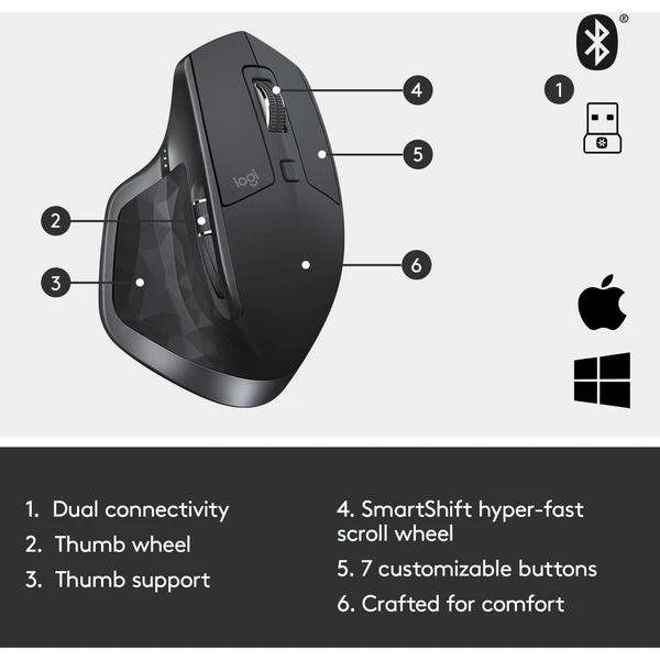 | Besonderheiten | Ermöglicht das Verschieben von FLOW-Inhalten zwischen 3 Geräten, optimale Steuerung auf praktisch jeder Oberfläche (auch Glas) dank hochpräzisem Darkfield-Tracking, Scrollrad mit anpassbarer Geschwindigkeit, schnell aufladbarer Akku mit bis zu 70 Tagen Laufzeit | ||
