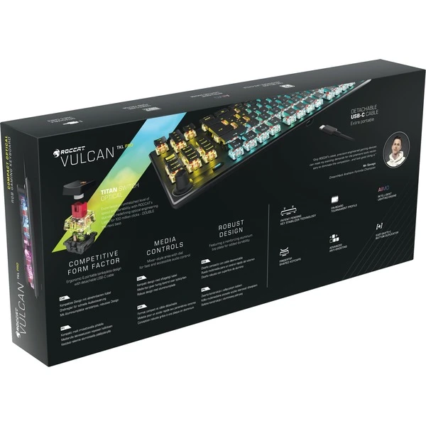 Die preisgekrönte Vulcan wurde in einem Tenkeyless-Format neu konzipiert und mit der Einführung des Titan Switch Optical von ROCCAT auf ein neues Level gehoben. Das neue Design schafft mehr Platz auf dem Schreibtisch für mehr Reichweite mit der Maus und ermöglicht eine natürlichere Haltung der Hände beim Spielen. Der neue Schalter ist ein Wunderwerk der optischen Technik, da er sich blitzschnell betätigen lässt und dadurch eine beispiellose Reaktionsfähigkeit erreicht. Die Vulcan TKL Pro verfügt außerdem über eine lebendige AIMO-Beleuchtung, ein ergonomisches flaches Design und Mediensteuerung im Mixer-Stil.Art.-Nr.: 1671190