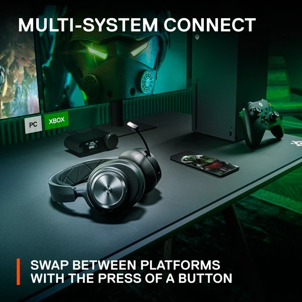Mit dem SteelSeries Arctis Nova Pro Wireless X ist man sofort startklar für die nächste Partie: Das Gaming-Headset bietet eine hohe Kompatibilität mit PC, Nintendo Switch, Xbox Series X|S, Playstation und mehr, dabei kann es drahtlos (Bluetoth) und per 3,5 mm Klinke oder über USB-C verbunden werden. Da die Hörmuscheln verstellt werden können, ist ein optimaler Sitz und eine gute Isolierung sicher gestellt, zusätzlich sorgt ANC (Active Noise Cancelling) mit dafür vorgesehenen Mikrofonen für einen Sound ohne Außengeräusche. Das dedizierte GameDAC erlaubt eine passgenaue Einstellung des Tons an den jeweiligen Inhalt und besitzt darüber hinaus ein brillantes OLED-Display zur besseren Erkennung. Neben einem satten Sound bietet das justierbare Mikrofon eine klare Sprachverständlichkeit, mit der man Taktiken optimal besprechen kann.Art.-Nr.: 1840324